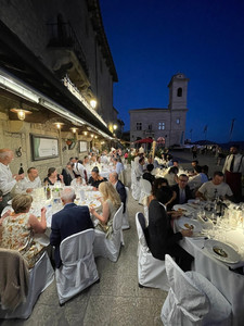 『天空の晩餐会』……2016年に初めてサンマリノで『サンマリノ・ニッポンまつり』が開催されたときに、こう名付けられた晩餐会は、見事な夕景と日没、そして世界遺産の歴史的な街の中に溶け込んでしまいそうな雰囲気の中で堪能する、世界でいちばん贅沢なDINNERです。見下ろす山並みが赤く染まる頃に、リベルタ広場にある一つ星のレストラン『Righi』でスタートしました。